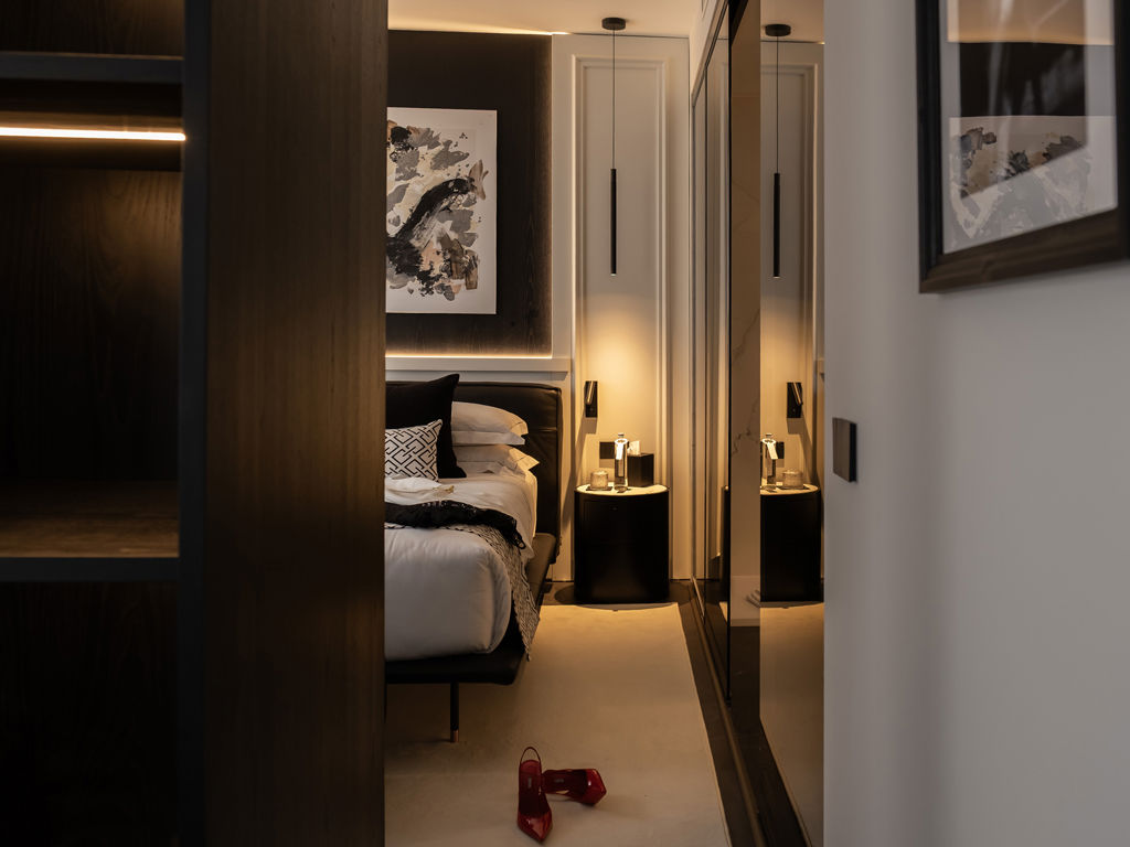 La camera da letto è avvolta dalla parete vetrata del bagno, dotato di doccia a vista. La palette in bianco e nero dona un’atmosfera sofisticata e intramontabile.