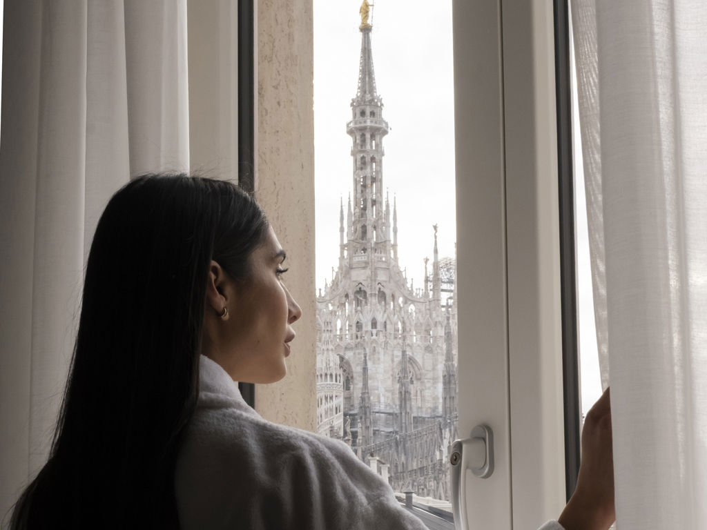 La Loft Suite Duomo è una suite dagli spazi aperti, pensata per reinterpretare in chiave contemporanea il concetto tradizionale di suite. Un’elegante armadiatura separa la camera dalla zona living, dove si trovano un confortevole angolo cottura e un’area con affaccio diretto sulle guglie del Duomo di Milano.